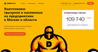 Дизайнеры студии Артемия Лебедева создали новую, яркую, современную и более удобную версию сайта для компании, которая занимается уничтожением вредных насекомых и грызунов. Сайт не только расскажет, как всё происходит, но и позволит сделать заказ очень актуальной сейчас услуги - обработки помещений от коронавируса онлайн.