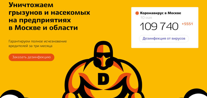 Фирменный стиль минималистичный и яркий. На логотипе – мускулистый супергерой в трико побеждает двух вредителей, а с появлением третьего - нового коронавируса, на сайт была добавлена кнопка-статистика заболеваемости в Москве. С помощью удобной навигации можно заранее узнать цену услуги, выбрать тип помещения, которое нужно обработать, площадь обрабатываемого пространства, и уже в конце уточнить род проблемы. Дезинфекция от Covid -19 и других вирусных респираторных инфекций является сейчас одной из самых доступных и востребованных услуг компании. Её стоимость - от 2900 рублей.