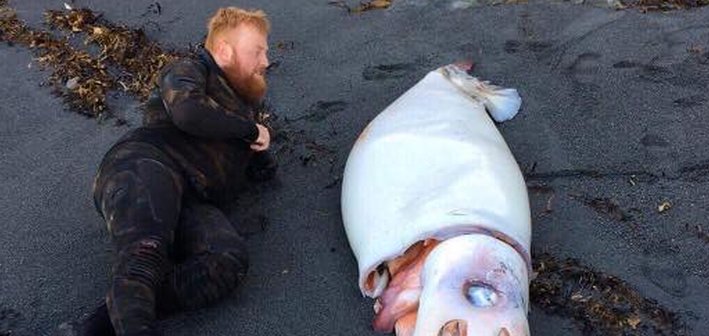 В Новой Зеландии на берег выбросило гигантского кальмара длиной более четырех метров. «Монстра» обнаружили дайверы Дэниел (Daniel), Джек (Jack) и Мэтью Аплины (Matthew Aplin), которые путешествовали по южному побережью Веллингтона. Братья искали подходящее место для дайвинга, когда случайно заметили нечто необычное на берегу.