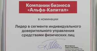 Управляющая компания «Альфа-Капитал» признана победителем в номинациях «Лидирующие позиции в сегментах управления средствами ОПИФов и БПИФов» и «Лидер в сегменте индивидуального доверительного управления средствами физических лиц».