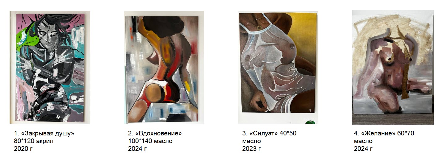 В рамках выставки зрителям будет представлено около 30 живописных и интерьерных работ, созданных художницей в период с 2020 года по сегодняшний день. Экспозиция охватывает широкий спектр художественных техник и направлений — от масляной и акриловой живописи до работ с гипсом и текстурными пастами. В числе представленных жанров — анималистика, портрет, силуэтная и интерьерная живопись.