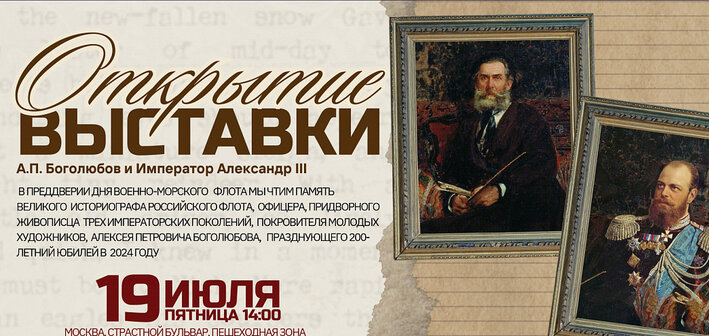 19 июля в 14 часов специально ко Дню ВМФ в центре столицы, на Страстном бульваре, откроется выставка "А.П. Боголюбов и Император Александр III”, которой мы чтим память великого историографа российского флота, офицера, придворного живописца трех императорских поколений, покровителя молодых художников, Алексея Петровича Боголюбова, празднующего 200-летний юбилей в 2024 году. Его работы занимают особое место в истории русского искусства и являются важным культурным наследием.
