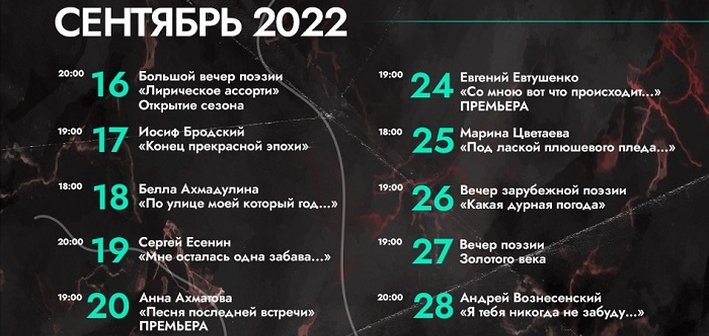 Первое выступление поэтов «НЕОЛИРЫ» на новой площадке состоится 16 сентября: 4-й театральный сезон откроется большим вечером поэзии под названием «Лирическое ассорти». В целом осень обещает быть для поэтов и любителей поэтического творчества очень насыщенной: выступать участники «НЕОЛИРЫ» планируют почти каждый день.