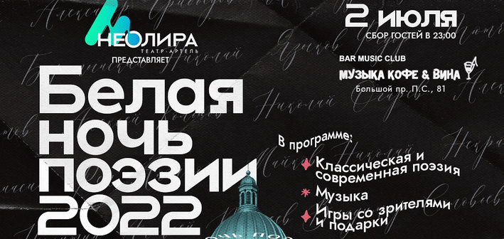 В Санкт-Петербурге впервые проведут «Белую ночь поэзии». Ее организатором является театр-артель «НеоЛира». Мероприятие состоится 2 июля 2022 года в Санкт-Петербурге. С 23.00 и до самого утра поэты будут читать гостям самые известные стихи российских и зарубежных авторов.