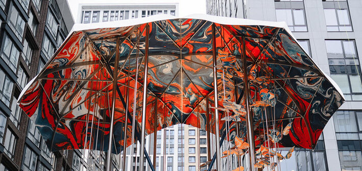 Арт-объект «Погода в доме» интерактивен: горожане могут укрыться под зонтом, почувствовать, как вокруг них возникает особая атмосфера и порхают бабочки в животе. Под куполом гостей ждет сотня бабочек — символ приятного чувства влюбленности. Каждая фигурка уникальна по окраске и создана автором вручную.