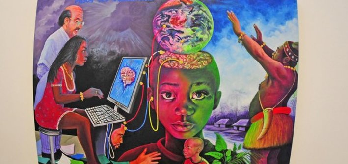 Дух многонационального творческого разнообразия так и витает в воздухе, на выставке можно увидеть даже настоящие афганские ковры, но персидские мотивы заменены образам войны времени советско-афганского конфликта. О социальном неравенстве, об эксплуатации и колониальной зависимости Африки говорит Ромуальд Азуме - художник из народности йоруба. Его работа «Груз» представляет собой ржавый скутер с канистрой, в которой контрабандой перевозили нефть из Нигерии.