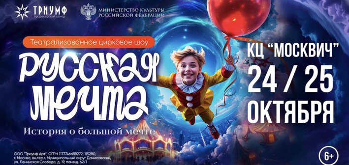 Уже этой осенью Москва станет площадкой для премьеры театрализованного циркового шоу «Русская мечта» — масштабного события, которое обещает стать одной из главных культурных сенсаций года. 24 октября 2025 года на сцене КЦ “Москвич” состоится первое представление шоу, не имеющего аналогов по уровню технологий, артистическому составу и художественной амбиции.