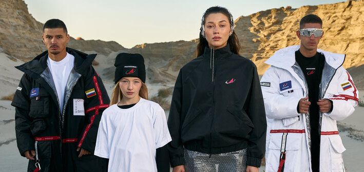 Женская линейка новой коллекции объединила технологичность и эстетику будущего. Главная модель — комбинезон, в котором женственность сочетается с трендами 2026 года: утончённый силуэт, множество функциональных карманов и акцентная фурнитура передают дух путешествий и свободы. В капсулу вошли также костюмы, куртки и худи, выполненные из премиальных тканей с инновационными утеплителями и защитой от влаги. Каждая деталь — от принтов с датами космических запусков до продуманной архитектуры кроя — напоминает, что мода тоже способна открывать новые миры.