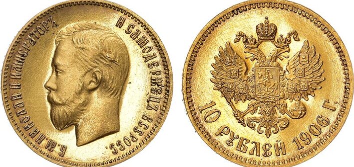 В 1906 г. на Санкт-Петербургском монетном дворе (минцмейстер Эликум Бабаянц) отчеканили всего 10 золотых монет номиналам 10 рублей. Уникально малый тираж объясняется тем, что их изготовили исключительно для подарков. Эти монеты считаются наиболее редкими и значимыми тиражными монетами периода правления Николая II, за которыми охотятся не только серьезные нумизматы, но и ведущие музеи мира.