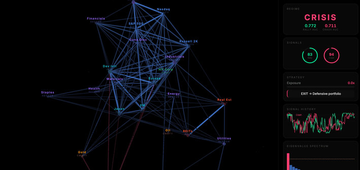 Но когда назревает кризис, сеть стягивается. Всё начинает двигаться вместе. Золото перестаёт вести себя как золото. ОФЗ перестают смягчать просадку акций. Доллар и юань, купленные «для подстраховки», неожиданно коррелируют с нефтью и индексом Мосбиржи. Убаюкивающая иллюзия диверсифицированного портфеля тихо растворяется — часто за недели до того, как основные индексы вообще дрогнут. Разработка Бориса Крюка и Фёдора Крюка наблюдает за этим стягиванием в реальном времени и на основе пятнадцати лет исторических данных научилась распознавать паттерны, предшествовавшие как обвалам, так и разворотам вверх.