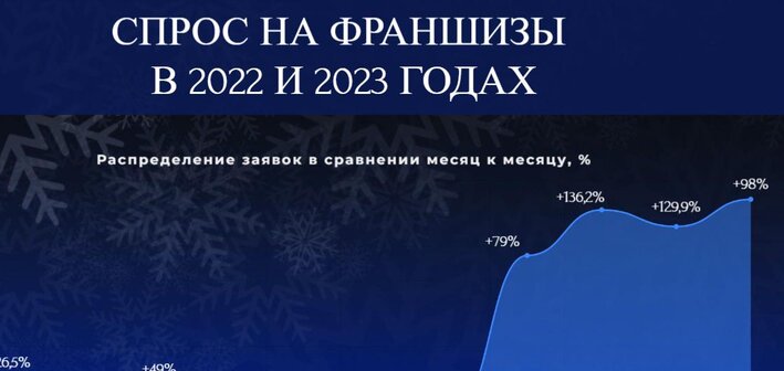 В отличие от 2022 года спрос на франшизы распределялся классическим образом и в соответствии с устоявшейся на рынке франчайзинга сезонностью. За счёт эффекта низкой базы 2022 года особенно заметно вырос осенний период (на осень прошлого года пришлось объявление частичной мобилизации). Значительно по числу заявок прибавили традиционные ранее пиковые месяцы – сентябрь (+136,2%), октябрь (+129,9%) и ноябрь (+98%).
