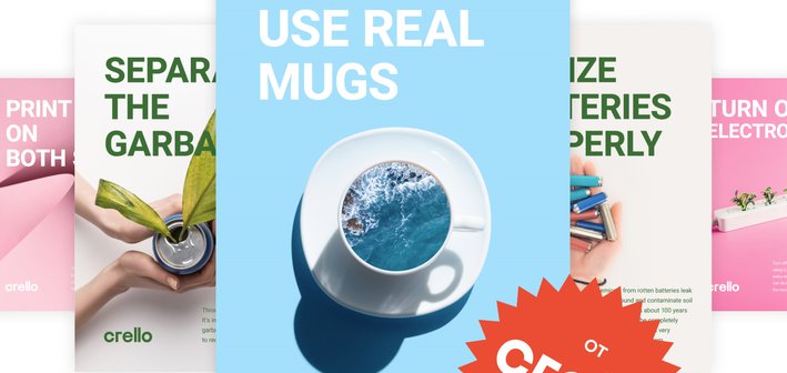 Маска для Instagram (и благотворительные отчисления за ее использование) — не единственное, что Crello делает в поддержку эко-инициатив. Также команда сервиса подготовила серию дизайнов для офисных постеров на эко-тематику. Они напоминают о том, как важно сортировать мусор, утилизировать батарейки, более экономно и с умом расходовать ресурсы и, конечно, приносить на работу растения. Сделать постер просто: достаточно выбрать готовый шаблон, отредактировать надписи и другие элементы, сохранить и распечатать или поделиться в социальных сетях. Специальные дизайн-навыки при этом не нужны.