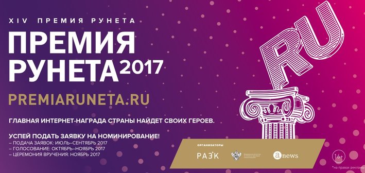 Премия Рунета — старейшая и самая престижная награда в российском сегменте сети интернет, отмечающая в этом году своё 14-летие, объявляет о старте приема заявок на номинирование в 2017 году.