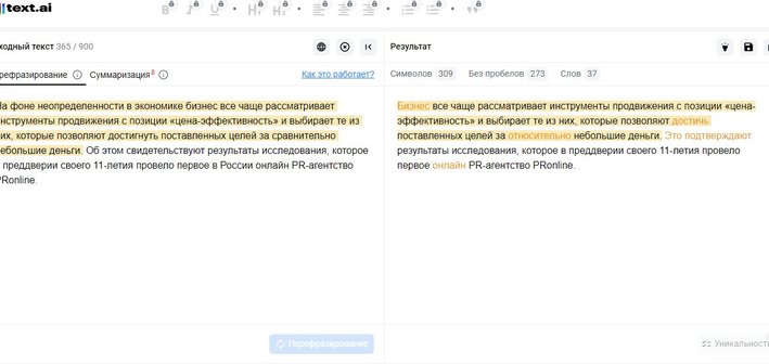 «Retext.AI» – это первый и единственный российский сервис перефразирования текста. Благодаря искусственному интеллекту, лежащему в его основе, он составляет высокую конкуренцию привычным синонимайзерам, предоставляя более качественный результат. Помимо функционала повышения уникальности текста, у сервиса есть бета-версия функции «Суммаризация». Этот инструмент позволяет пользователям мгновенно создавать краткое изложение к статьям. Бесплатно с «Retext.AI» можно перефразировать до 400 знаков, после авторизации – до 900 знаков, а для полноценной работы можно оформить один из платных пакетов, который позволит обрабатывать 1 млн знаков в месяц.