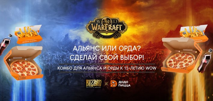 В честь 15-летия World of Warcraft Blizzard Entertainment совместно с «Додо Пицца» подготовили специальное предложение: уникальное юбилейное меню по мотивам игры, а также возможность обменивать достижения в World of Warcraft на скидки и подарки в «Додо Пицца» с помощью приложения «ВКонтакте».