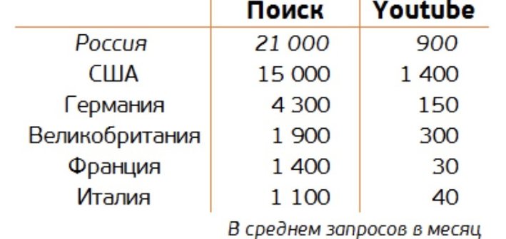 Анализ основан на изучении статистики поисковых запросов на разных языках для отдельных стран в Яндекс, Google и YouTube. В статистике приведены средние значения за месяц на основании данных за последний год.