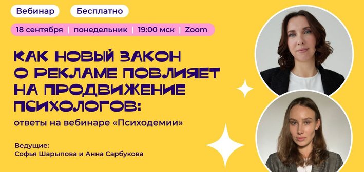 С 1 сентября 2023 года начали вводиться штрафы за размещение рекламы в интернете без маркировки — их сумма может достигать 500 тыс. рублей. Теперь каждый участник рынка интернет-рекламы, включая психологов, продвигающих свои услуги онлайн, обязан отчитываться в Роскомнадзор через ОРД. Онлайн-школа «Психодемия» проведет бесплатный вебинар, в рамках которого опытные юристы ответят на вопросы о новых правилах размещения рекламных объявлений, помогут разобраться в тонкостях закона «О рекламе» и дадут понятные рекомендации простыми словами.