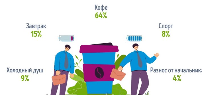 64% опрошенных не могут проснуться без кофе, а 4% ? без бодрящего разноса от начальства.