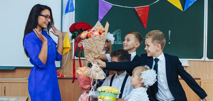 Классикой для первого сентября считается небольшой букет из хризантем или гербер, а наступающая осень позволяет сделать выбор в пользу садовых астр. Для тех, кто все же хочет подобрать индивидуальный и запоминающийся подарок есть простой совет: отталкивайтесь прежде всего от возраста учителя. Опытному педагогу преподнесите цветы глубоких и насыщенных тонов, молодому — нежную композицию с французскими печеньями «макарон». Если классный руководитель вашего школьника мужчина не отказывайтесь от приятной традиции, сдержанный и строгий букет с экзотическими суккулентами вполне будет соответствовать ситуации.