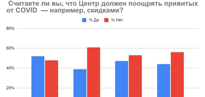 Положительно ответили от 39 до 52% опрошенных (в зависимости от площадки). «Скидки привитым — социальная ответственность организации», — считают многие слушатели Центра. Отрицательно проголосовали от 48 до 61% респондентов.