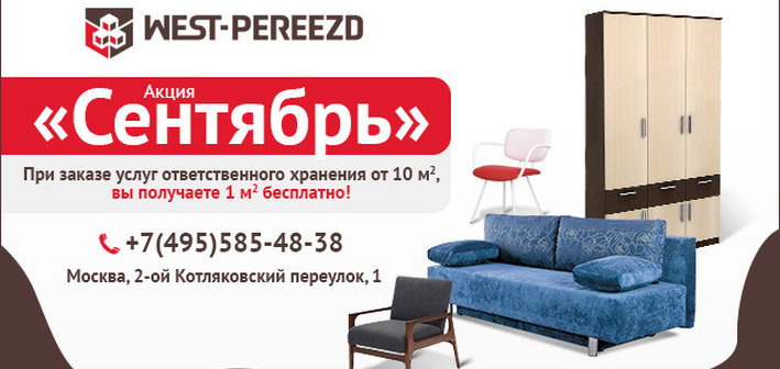 Компания «ВЕСТ-ПЕРЕЕЗД» объявляет о начале акции «Сентябрь». Жители и гости Москвы и Московской области, воспользовавшись данным спецпредложением, действующим только в сентябре 2017, при заказе услуг ответственного хранения мебели и вещей на время ремонта или переезда на 10 м2 и более получат 1 м2 бесплатно!