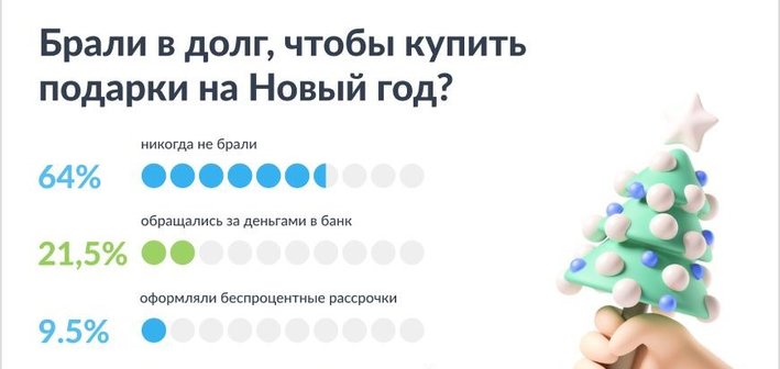 Идея обратиться за заемными средствами для того, чтобы отпраздновать Новый год и купить подарки для друзей и близких, не нашла поддержки почти у ? россиян: 64% респондентов никогда не брали кредит на праздничные покупки и не планируют этого делать в дальнейшем. Подобный опыт есть лишь у 21,5% опрошенных, бравших кредиты в банках. 9,5% прагматично предпочитают оформлять в магазинах беспроцентные рассрочки, 4% привлекают заемные средства по-старинке, занимая деньги в долг у друзей и родственников. В микрофинансовые организации обращаются не более 1%, что безусловно говорит о повышении уровня финансовой грамотности в стране.