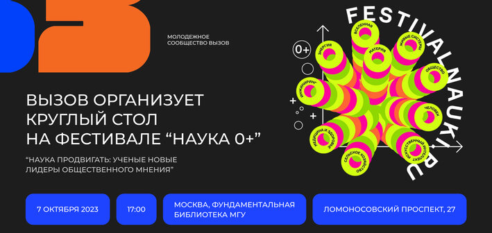 С 6 по 8 октября на разных площадках столицы пройдет Московский фестиваль «Наука 0+». В рамках мероприятия молодежное сообщество ВЫЗОВ проведет круглый стол «Наука продвигать: ученые новые лидеры общественного мнения», а также организует креативную зону «Новые лица», позволяющую всем участникам фестиваля записать видеопрезентацию.