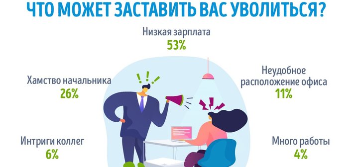 53% участников опроса сменили бы работу, если бы были недовольны зарплатой, а 26% признались, что уволиться их могло бы вынудить хамство начальника.