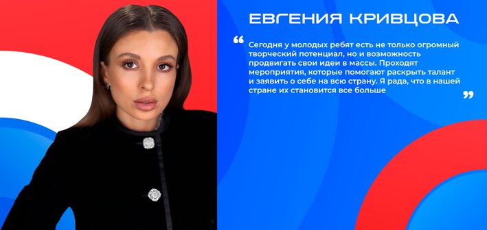 Евгения Кривцова будет ведущей, проведет викторину, а также примет участие в квартирнике, на котором выступит Владимир Селиванов (VAVAN). Общаясь с артистом и зрителями, Евгения создаст атмосферу дружеской встречи. Мероприятия пройдут в доме молодежи «Вызов» на Федеральной территории «Сириус» в рамках Всемирного Фестиваля молодежи в Сочи. Дом молодежи будет организован продюсерским центром «Инсайт Люди» и объединит не только молодых ученых, но и популярных блогеров, артистов театра, кино и цирка. На протяжении всего Фестиваля дом молодежи «Вызов» будет занимать одно из центральных мест на территории «Сириус», включая в себя как деловую, так и развлекательную программы.