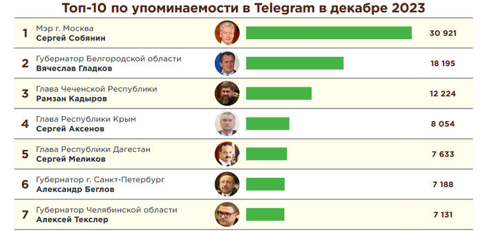 Замыкает ТОП-10 Telegram рейтинга губернатор Нижегородской области Глеб Никитин (6173), демонстрирующий стабильно высокие медиа показатели. В декабре Никитин провел привлекшую особое внимание «прямую линию», ответив «без купюр» на довольно острые и «непричесанные» вопросы жителей региона. Губернатор также оказался в фокусе в связи с региональной инициативой нижегородских депутатов о запрете абортов в частных клиниках. Кроме того, декабрь Никитина ознаменовался значимыми и знаковыми поводами по поддержке СВО: Нижегородская область оказалась единственным субъектом РФ, которому было доверено на съезде «Единой России» объявить об отправке партийного гумконвоя на Донбасс, кроме того – от правительства региона при поддержке «Дома народного единства» в зону СВО ушла ещё одна большая предновогодняя посылка, причём новогодние коробки с поздравлениями и полезными наборами для нижегородских военнослужащих в числе волонтеров собирали заместители губернатора Беркович и Гнеушев.