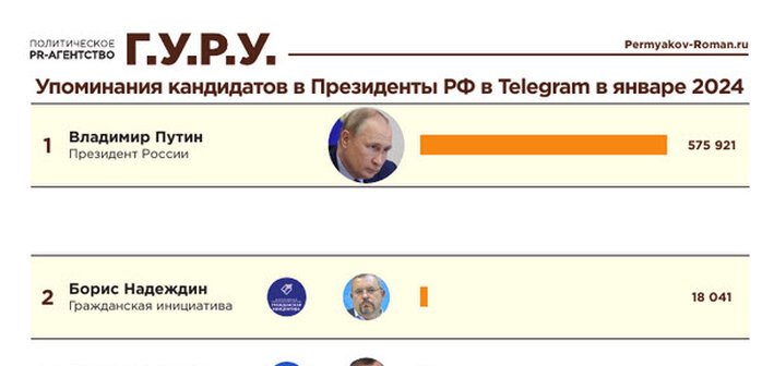 Рейтинг упоминаний кандидатов в президенты в Telegram за январь 2024 года.
