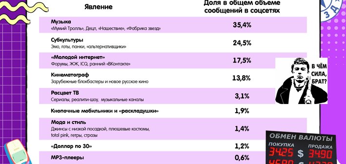Как оказалось, вектор сетевой ностальгии направлен в сторону культуры, общественной жизни и технологий. Экономические аспекты нулевых вызывают чувство приятной грусти гораздо реже, хотя и во многом определили тот самый «сытый» контекст эпохи. Вероятно, это связано со спецификой пользовательских сообщений в соцсетях: большинство из них – это комментарии к роликам, фото и постам на тему нулевых, где эпоха раскрывается именно через культуру, людей, а также технологические и технические приметы времени.