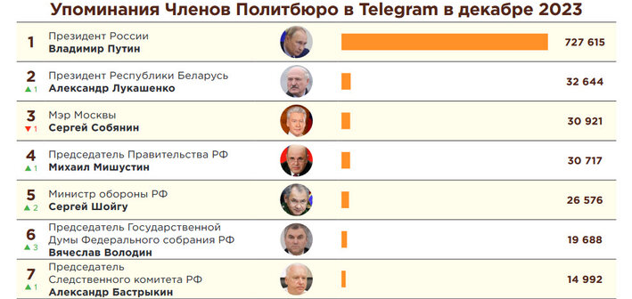 Безусловный и бессменный лидер медиа рейтинга президент Владимир Путин в декабре упоминался в Telegram-каналах более 727 тысяч раз, что почти что вдвое больше, чем в ноябре. В качестве основных причин всплеска и без того высокого внимания аналитики выделяют заявление о решении баллотироваться на новый срок, озвученное президентом в ходе беседы с героями СВО, и прямую линию «Итоги года с Владимиром Путиным», совмещенную с большой пресс-конференцией президента. Решение президента баллотироваться на новый срок было активно поддержано лидерами общественного мнения и публичными политиками, в том числе губернаторами; на следующий же день после заявления президента на базе «Народного фронта» собралась инициативная группа по поддержке выдвижения кандидатуры Владимира Путина на выборы, в которую вошли известные политики, общественные деятели, звезды эстрады и участники СВО. Также в исследовании отмечается, что в декабре в регионах начали открываться региональные штабы общественной поддержки президента и начался сбор подписей в поддержку выдвижения Владимира Путина - активная фаза избирательной кампании «Путин 2024» официально стартовала.
