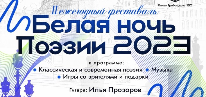 В Санкт-Петербурге пройдет II ежегодный поэтический фестиваль «Белая ночь поэзии». Ее организатором является лирико-драматический театр «НЕОЛИРА». Мероприятие состоится 1 июля 2023 года. С 16.00 поэты будут читать гостям самые известные стихи российских и зарубежных авторов.