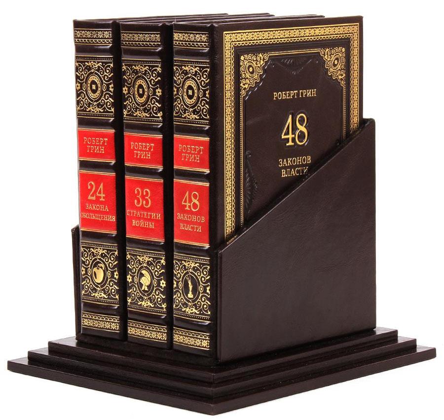 Это издание стало безусловным лидером среди подарков для управленцев и топ-менеджмента. Книга воспринимается как символ власти, стратегического мышления и личной ответственности руководителя. Цельнокожаный переплет ручной работы украшен цветной кожаной вставкой, а также золотым и блинтовым тиснением, подчеркивающим статус издания. Корешок декорирован классическими бинтами, придающими книге архитектурную строгость.