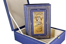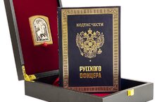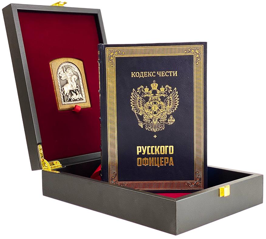 Этот набор стабильно выбирали в качестве подарка руководителям силовых структур и людям, для которых понятия чести и долга имеют фундаментальное значение. Книга выполнена в цельнокожаном переплете ручной работы с золотым и блинтовым тиснением. Обрез окрашен в тон переплета, что создает цельный визуальный образ. Форзацы богато оформлены составными дублюрами, а ляссе выполнено из натурального шелка.