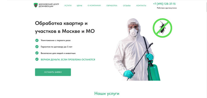 Индивидуальный подход к каждому клиенту и гарантия до 5 лет на все виды работ. «Московский центр дезинфекции» работает более 10 лет и предоставляет широкие услуги по удалению неприятных запахов, плесени, загрязнений, уничтожает грызунов и вредителей в любых типах помещений. В работе используется иностранное оборудование и современные методы борьбы – холодный и горячий туман, специальные препараты (не вредят окружающей среде.).