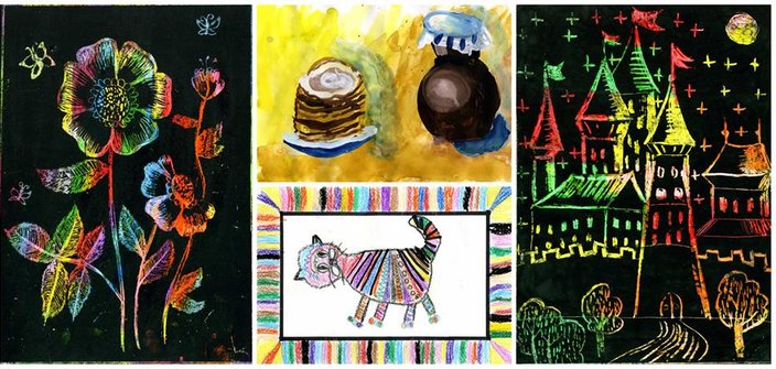 Чего здесь только нет! Разные направления, разнообразные темы и идеи, воплощенные в законченные произведения, разные техники и материалы. Рисование нетрадиционными техниками открывает широкий простор для детской фантазии, дает ребенку возможность увлечься творчеством, развить воображение, выразить свою индивидуальность. Маленькие художники рисуют точками или выдувают кляксы трубочками, используют жесткие кисти и шарики для создания своих первых шедевров. Кроме пастели и сангины на бумагу ложится мыльная пена и пена для бритья. Всем известная пекинская капуста создает диковинные образы. А морковка с картошкой удивляют необычными узорами. Какие неповторимые линии и фигуры остаются от мятой бумаги и обычной пластмассовой вилки! А что творят ладошки и детские пальчики?!