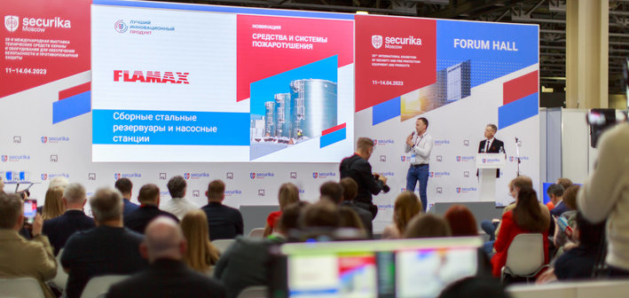 Бренд FLAMAX основан в 2008 году, а в выставке Securika Moscow принимал участие в 7й раз. По традиции, стенд компании пользовался популярностью у посетителей. Выполненный в стиле loft в фирменном черно-красном цвете, в его центре располагалась полноразмерная модель импортозамещенного резервуара для хранения промышленных объемов воды.