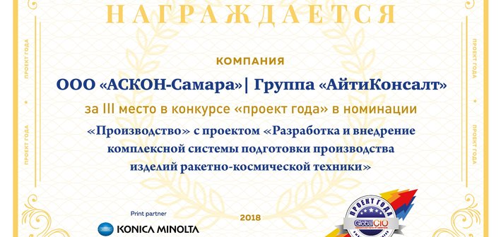 Ведущий ракетно-космический центр страны АО "РКЦ "Прогресс" при поддержке и участии специалистов ООО АСКОН-Самара (Группа АйтиКонсалт) успешно разработал и внедрил систему для подготовки производства изделий ракетно-космической техники. В рамках формирования единого информационного пространства были разработан и внедрен комплекс систем, обеспечивающий автоматизированную подготовку инженерной документации на все типы изделий, приведены в соответствие с нормативными документами базы данных и справочники информации по оборудованию, оснастке, режущему и измерительному инструменту, материальным, трудовым нормам и автоматизированы другие бизнес-процессы.