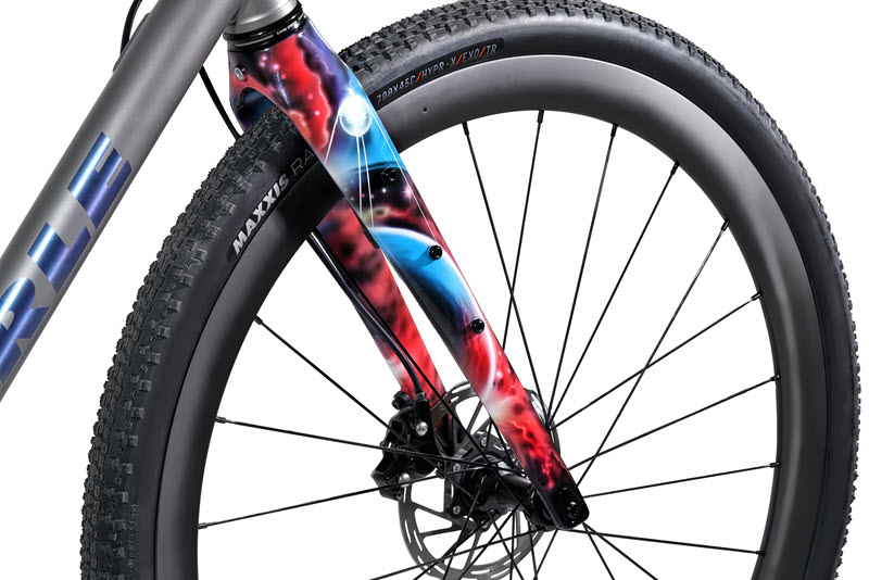 Рама выполнена из титанового сплава, который применяется в том числе при изготовлении спутников и пилотируемых космических кораблей. Карбоновая вилка получила эксклюзивную ручную аэрографию в космической тематике — каждая из трёх моделей имеет уникальный рисунок. Беспроводная трансмиссия SRAM Rival AXS 1×12 обеспечивает молниеносное переключение передач без тросиков. Вся проводка скрыта внутри рамы.