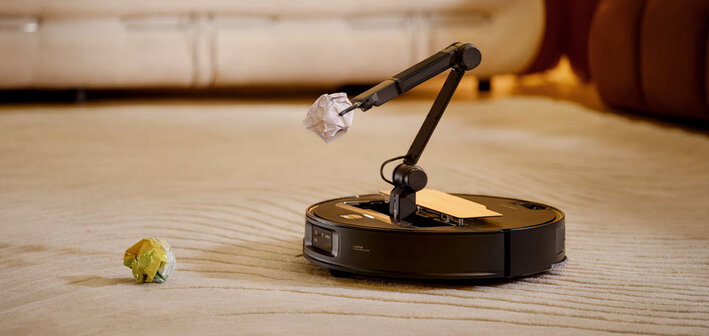 Этот инновационный робот-пылесос оснащен технологией OmniGrip™ — первым в мире* серийным складным пятиосевым роботизированным манипулятором, который способен разворачиваться для очистки ранее труднодоступных зон и1 убирать мелкие предметы, такие как носки, небольшие полотенца, салфетки и тапочки весом до 300 г.