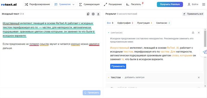 Нейросеть для создания уникальных текстов Retext.AI разработала инновационный инструмент на основе ИИ, предназначенный для поиска и исправления ошибок в онлайн-режиме «Грамматик». Благодаря ему пользователи могут выбирать различные варианты исправления ошибок, найденных в тексте.