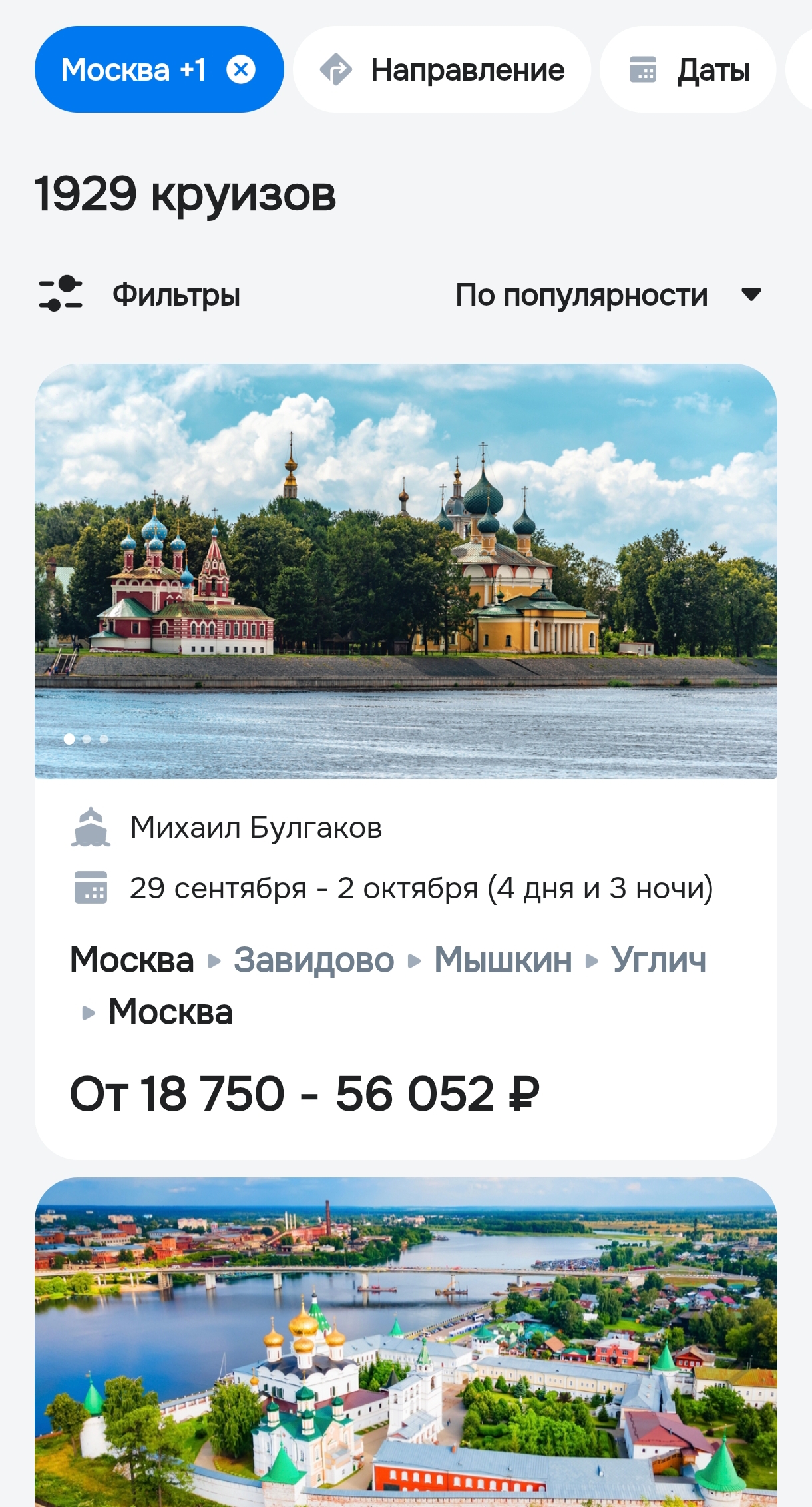 Через новое приложение российские путешественники могут выбрать один из 19 500 туров, сейчас доступны 6 450 речных круизов и морских 13 050 круизов. В новом приложении представлены рейсы с подробным описанием из популярных туристических городов России по разным направлениям. Из Москвы доступны 1850 рейсов, из Санкт-Петербурга 500 рейсов, из Нижнего Новгорода 750 рейсов, из Казани 750 рейсов, из Самары 400 рейсов, из Перми 250 рейсов, из Ярославля 250 рейсов, из Волгограда 150 рейсов, из Ростова-На-Дону 50 рейсов, из Астрахани 100 рейсов.